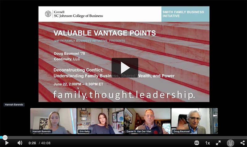 In this video, Continuity Founding Partner Doug Baumoel shares 5 foundational concepts to help viewers better understand and manage the unique type of conflict that happens when families work and own together. This recent event was hosted by the Smith Family Business Initiative at Cornell University.